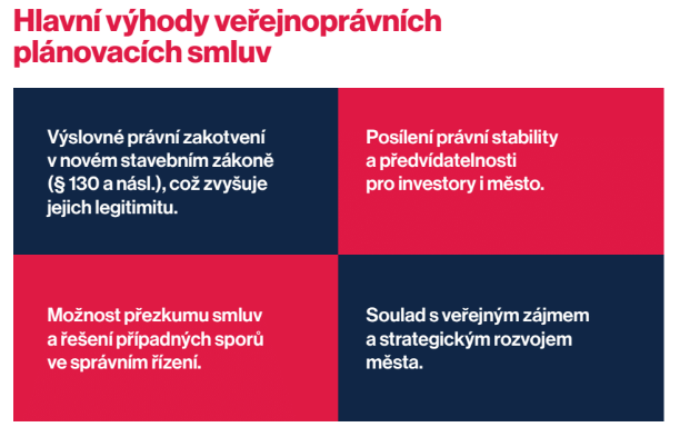 Plánovací smlouvy začlenil jako standardní nástroj samospráv nový stavební zákon, který vstoupil v účinnost v roce 2024. Investorům tento přístup přináší průhledné a koordinované procesy při schvalování záměrů. Investiční plnění, které výrazně pomáhá rozpočtům měst, přitom pro investory představuje položku v řádu pouhých 1–2 % nákladů na celou výstavbu.